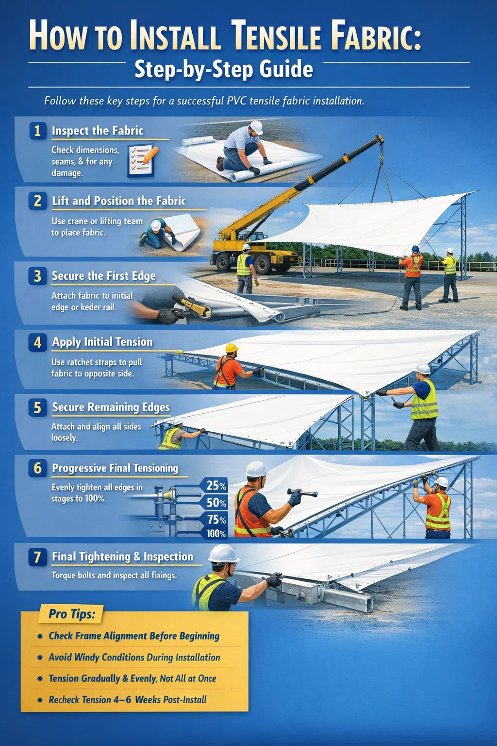 নিম্নলিখিত ক্রমটি বেশিরভাগ বাণিজ্যিক এবং স্থাপত্য পিভিসি প্রসার্য ফ্যাব্রিক ইনস্টলেশনের ক্ষেত্রে প্রযোজ্য। ব্যবহৃত নির্দিষ্ট প্রান্ত সংযুক্তি সিস্টেমের উপর ভিত্তি করে সামঞ্জস্য করুন — কেডার রেল, প্লেট ক্ল্যাম্প, বা দড়ি-ইন-চ্যানেল।