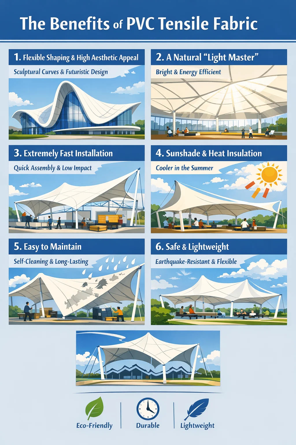 এর সুবিধার কথা বলছি পিভিসি প্রসার্য ফ্যাব্রিক , আধুনিক স্থাপত্যে এর জনপ্রিয়তা, বিশেষ করে স্টেডিয়াম, ওপেন-এয়ার প্লাজা এবং ল্যান্ডস্কেপ শেডিংয়ে, ঐতিহ্যবাহী উপকরণের তুলনায় এর অনেক অনন্য সুবিধার কারণে।