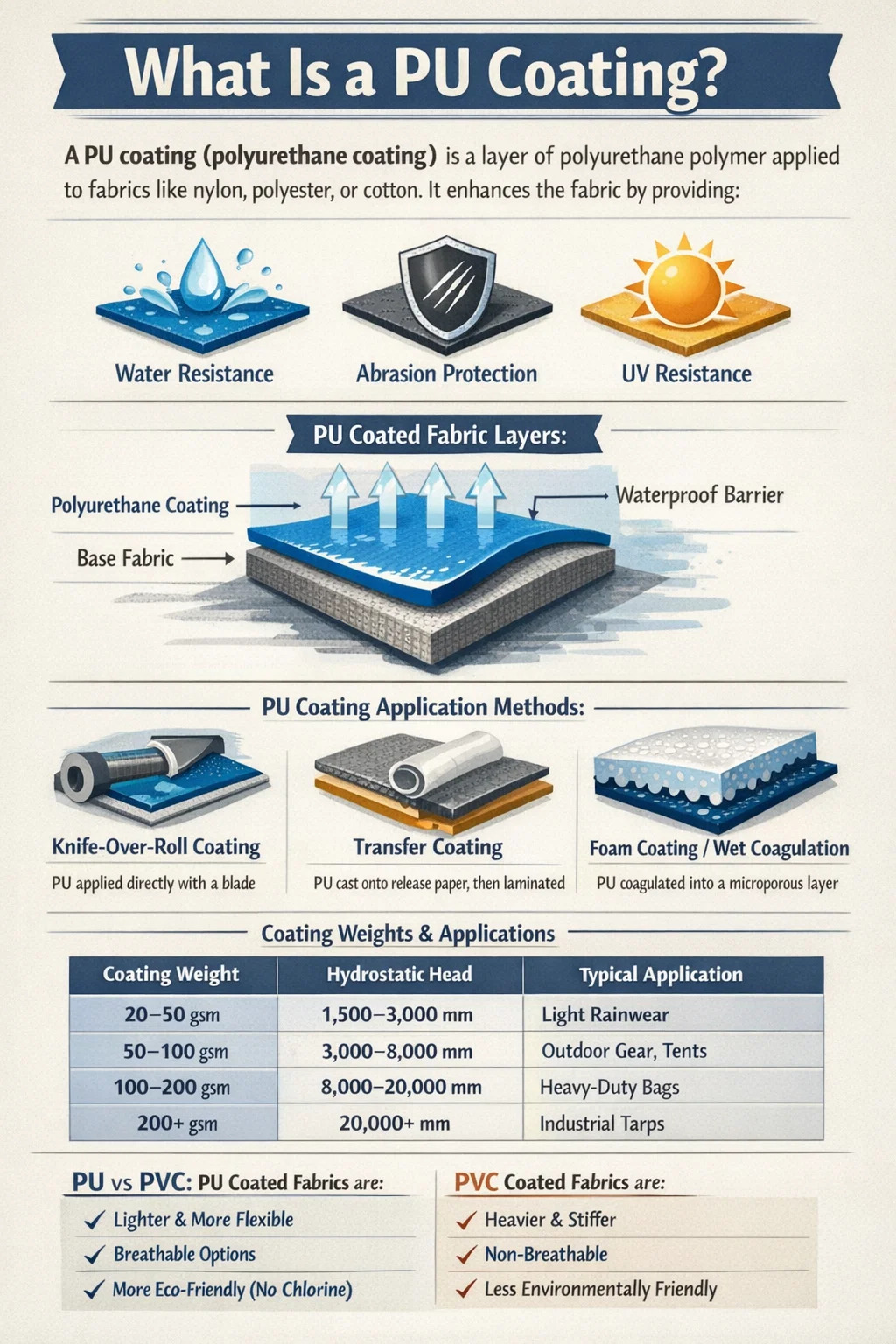 একটি PU আবরণ - পলিউরেথেন আবরণের জন্য সংক্ষিপ্ত - হল পলিউরেথেন পলিমারের একটি স্তর যা সরাসরি একটি বেস ফ্যাব্রিকের উপর প্রয়োগ করা হয়, যেমন নাইলন, পলিয়েস্টার বা তুলো, এর কার্যকারিতা বৈশিষ্ট্যগুলিকে উন্নত করতে। আবরণ রাসায়নিকভাবে এবং যান্ত্রিকভাবে টেক্সটাইল পৃষ্ঠের সাথে সংযুক্ত করে, একটি অবিচ্ছিন্ন, নমনীয় ফিল্ম তৈরি করে যা জলের অনুপ্রবেশ, ঘর্ষণ এবং অনেক ফর্মুলেশনে, অতিবেগুনী ক্ষয় প্রতিরোধ করে।