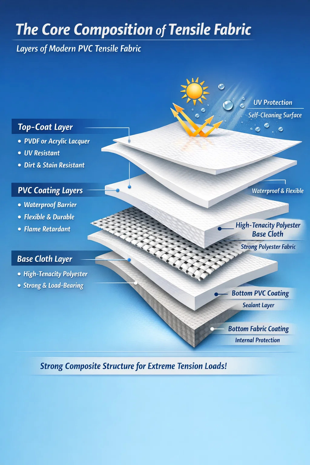 সবচেয়ে আধুনিক পিভিসি প্রসার্য ফ্যাব্রিক তিনটি প্রাথমিক স্তর নিয়ে গঠিত একটি পরিশীলিত যৌগিক উপাদান: ক উচ্চ দৃঢ়তা পলিয়েস্টার বেস কাপড় , একটি পুরু পিভিসি (পলিভিনাইল ক্লোরাইড) আবরণ , এবং একটি বিশেষ শীর্ষ কোট বার্ণিশ যেমন PVDF বা এক্রাইলিক। অভ্যন্তরীণ ফ্যাব্রিক ব্যাপক উত্তেজনা ভার পরিচালনা করার জন্য কাঠামোগত শক্তি প্রদান করে, যখন বাইরের প্লাস্টিকের স্তরগুলি পরিবেশগত অবক্ষয়, জল এবং আগুন থেকে ফাইবারগুলিকে রক্ষা করে।