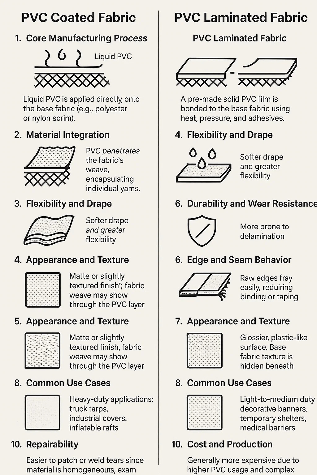 এখানে মধ্যে পার্থক্য পিভিসি লেপা ফ্যাব্রিক এবং পিভিসি স্তরিত ফ্যাব্রিক পয়েন্ট দ্বারা বিন্দু ব্যাখ্যা করা হয়েছে: