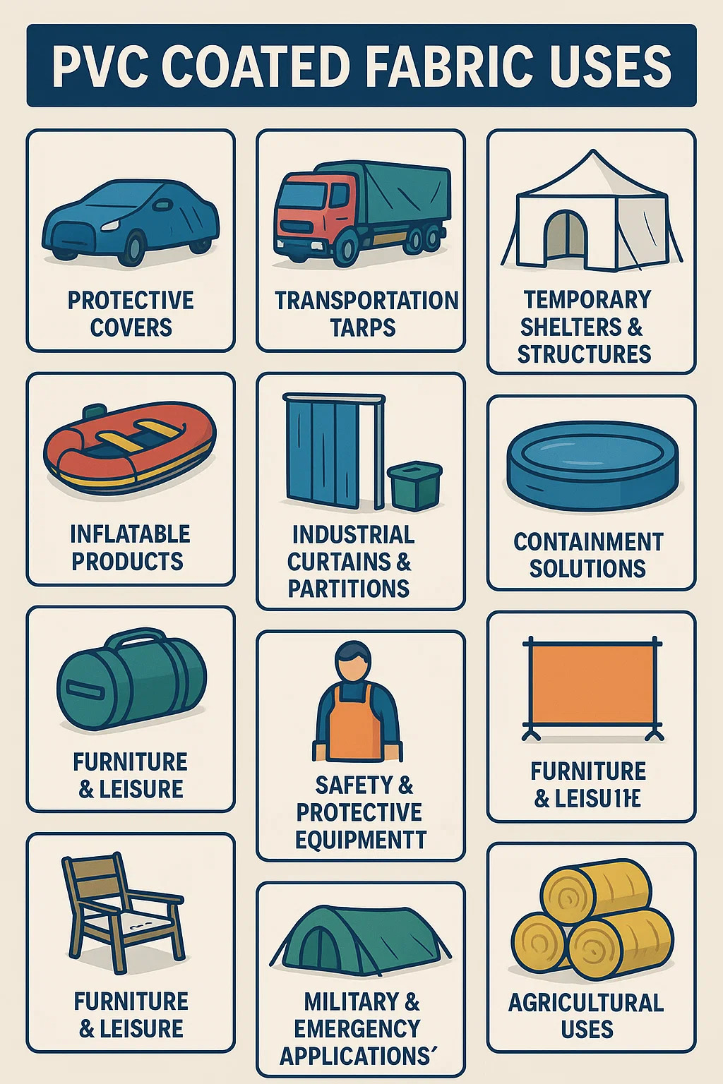 এখানে সাধারণ ব্যবহারের একটি ব্রেকডাউন রয়েছে পিভিসি লেপা ফ্যাব্রিক , এর ব্যবহারিক প্রয়োগগুলি প্রতিফলিত করে: